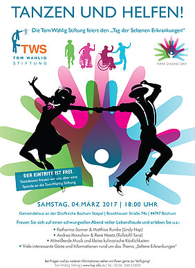 You are invited to our dancing party with Lindy Hop and Wheelchair Dance in Bochum Stiepel on March 4th at 6 pm. We will inform you about our work and rare diesaeses.