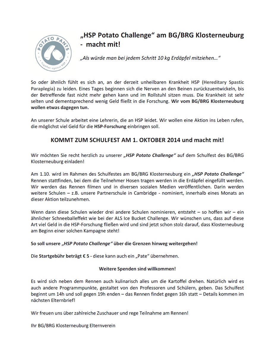 ALS is as you know a lot worse than HSP, however we are pleased that a school in Klosterneuburg, Austria organized a HSP challenge.