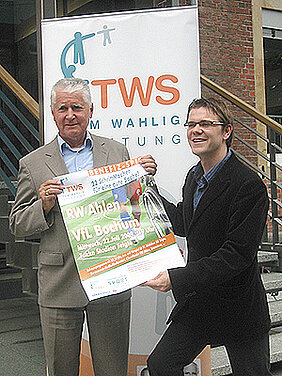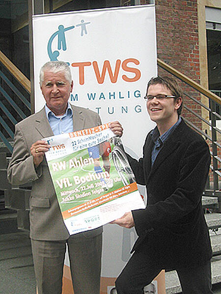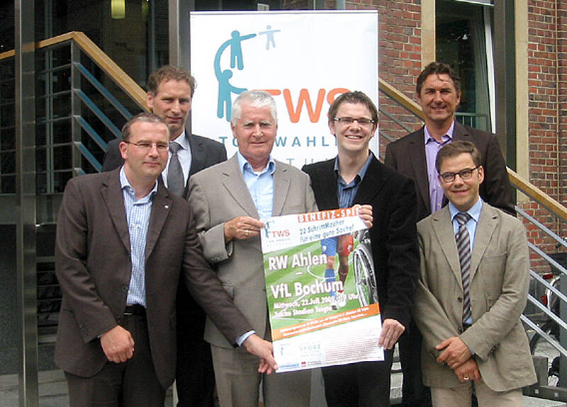 [Translate to Englisch:] Wir freuen uns auf das Benefizspiel! - Von links: Antonius Kapusta (SG Telgte), Ansgar Schwenken (Vorstand VfL Bochum), Dr. Tom Wahlig, Henry Wahlig, Stefan Grädler (Manager RW Ahlen), Prof. Dr. Peter Young (UK Münster)